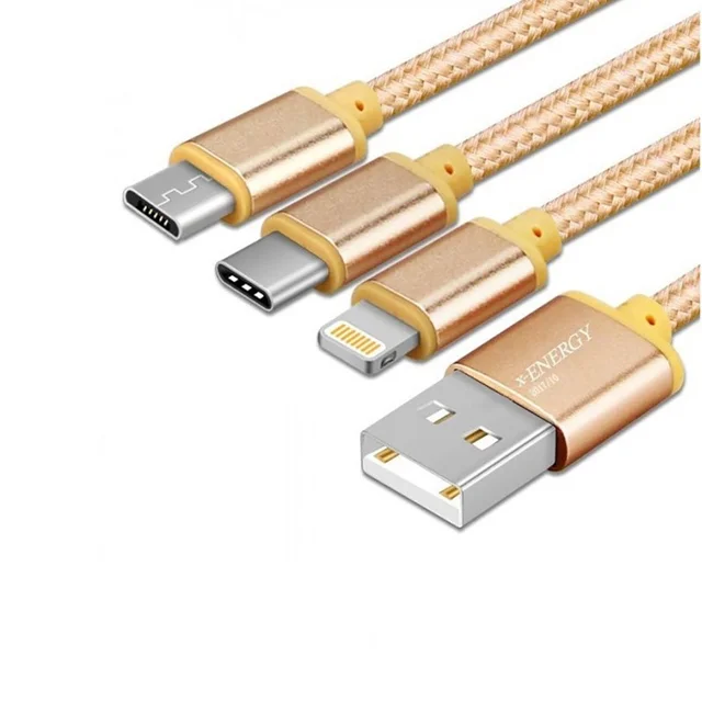 امروزه گوشی های موبایل دارای سه پورت شارژ لایتنینگ ، میکرو یو اس بی و تایپ سی می باشند که شما برای شارژ هر کدام از این دستگاه ها باید کابل مخصوص به آن را با خود داشته باشید.کمپانی ایکس انرژی با ساخت این کابل باعث شده تا شما بتوانید با به همراه داشتن یک کابل هر سه گوشی را شارژ کنید.این کابل دارای کانکتور های Lightning ، Type-C و Micro USB بوده و به شما این امکان را می دهد تا هر نوع گوشی را با شدت جریان و ولتاژ 5V-3.5A شارژ کنید. بدنه این محصول دارای روکشی کنفی بوده که این امر باعث شده تا مقاومت آن در برابر گره خوردن ، کشش و پارگی از سطح بالایی برخوردار باشد.طول این کابل 100 سانتی متر بوده که نسبت به کابل های معمولی آزادی عمل بیشتری به کاربر می دهد و شما می توانید به صورت آزادانه سه گوشی موبایل را با آن شارژ کنید.این کابل قابلیت انتقال اطلاعات را هم برای گوشی ها داشته و به شما امکان این را می دهد تا بتوانید به راحتی اطلاعات گوشی خود را با سرعت بالا انتقال دهید.