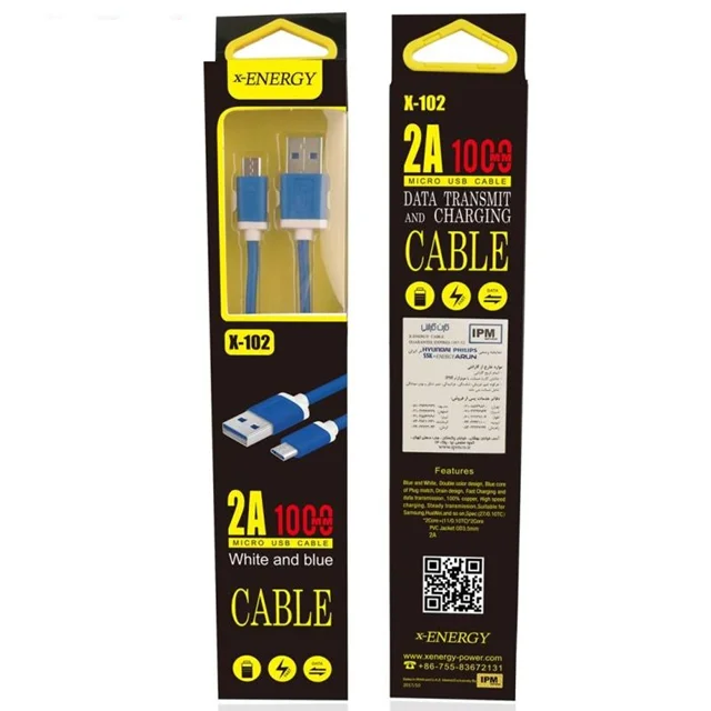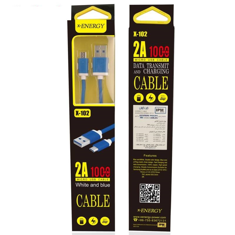 ایکس انرژی (x-ENERGY) که برندی مشهور و شناخته شده در زمینه تولید لوازم جانبی است کابل X-102 طراحی ظریفی دارد این کابل 100 سانتیمتر طول دارد و با انواع گوشیهای موبایل، تبلت، دوربینهای دیجیتال و دیگر لوازم مجهز به درگاه microUSB سازگار است. در یک سمت از این کابل یک کانکتور microUSB و در سمت دیگر آن یک کانکتور USB به کار رفته است. شما میتوانید کانکتور USB موجود در این کابل را به یک دستگاه مجهز به این درگاه مانند کامپیوتر یا لپتاپ متصل کنید؛ سپس سمت دیگر کابل را به تبلت یا گوشی موبایلتان وصل کرده و اطلاعات را میان آنها انتقال دهید. همچنین این امکان وجود دارد که کانکتور USB کابل را به یک شارژر دیواری متصل کرده و باتری گوشی موبایل یا تبلت خود را شارژ کنید همچنین میتوان از آن بهعنوان کابل یدک مخصوص استفاده برای شارژر فندکی و پاوربانک استفاده کرد. رشتههای مسی داخل این کابل با روکشی از جنس PVC پوشانده شدهاند. این روکش مقاوم است و باعث میشود کابل در برابر گره خوردن یا درهم پیچیدن مقاومت زیادی داشته باشد. سرعت انتقال اطلاعات و شارژ در این محصول 2 آمپر است.