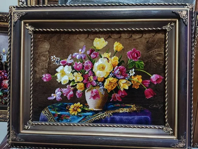 افسون هنر اصیل ایرانی را با تابلو فرش دستباف گل و گلدان کتیبه به خانهتان بیاورید! این اثر هنری با چله نخ و گلهای ابریشمی در ابعاد ۵۰/۷۰، زینتبخش دیوارهای منزل شماست. هدیهای ماندگار و لوکس که با زیبایی و کیفیت بینظیرش، جذابیت فوقالعادهای به فضای شما میبخشد.