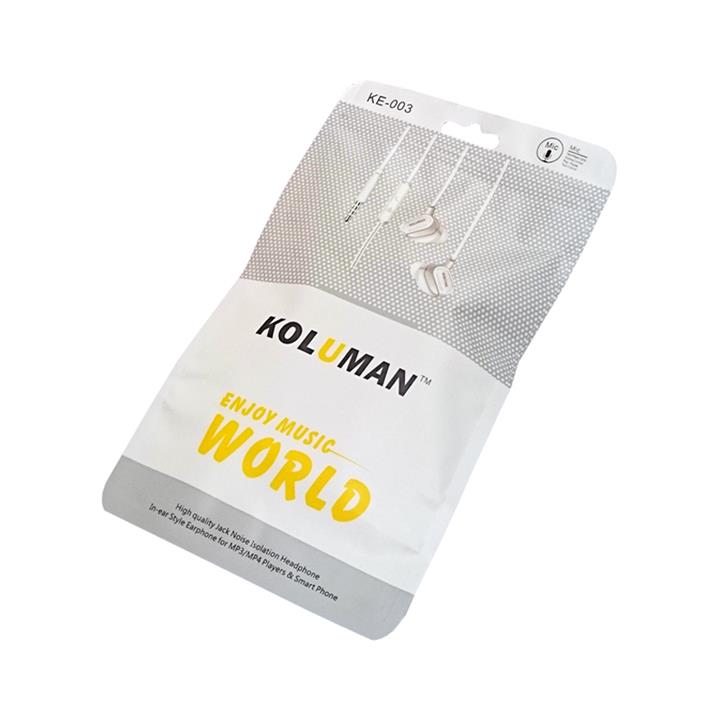 هندزفری کلومن مدل KE-003 که مخصوص گوشکردن به موسیقی طراحی شده است و قابلیت مکالمه هم دارد و کاملا منطبق بر شنوایی انسان است. این هندزفری ارگونومیک طراحیشده تا استفاده بلند مدت از آن باعث ایجاد خستگی و درد نشود. این هندزفری بسیار سبک است و کاربر هنگام استفاده از آن، بههیچوجه وزنی احساس نمیکند. طراحی داخلگوشی پدها باعث میشود صدای خروجی از هندزفری ایزوله شود و کاربر صدای محیط اطراف را نشنود. صدای باکیفیت بیس باعث شده است که این محصول به هندزفری مناسب برای افراد علاقهمند به موسیقی تبدیل شود. روی کابل دارای روکش پلاستیکی این هدفون پنل مدیریتی هدفون به چشم میخورد که به کمک آن میتوانید اقدام به کم و زیاد کردن صدای موسیقی و کنترل قطع و وصل شدن موزیک در حال پخش کنید و همچنین توسط این پنل مدیرینی میتوانید تماس های خود را مدیریت کنید .