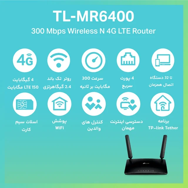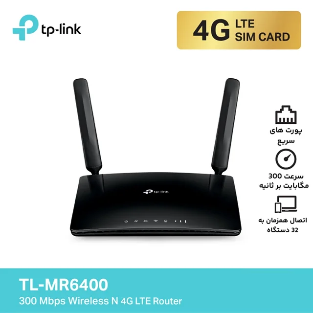 مودم MR6400 یک محصول با کیفیت از شرکت تیپی-لینک (TP-LINK) است که تنها با قرار دادن یک سیم کارت نسل چهارم (4G) در آن میتوانید از اینترنت پرسرعت استفاده کنید. این مودم روتر از دو آنتن با 2.4 گیگاهرتزی داخلی برای ایجاد شبکه Wi-Fi و دو عدد آنتن بیرونی برای اتصال به آنتنهای BTS اپراتور بهره می برد و با این ترکیب این دو مجموعه آنتن، میتواند اینترنت سیمکارت شما را به صورت بیسیم در محیط اطرافتان ارایه دهد. برای استفاده از MR6400 تنها کافی است که سیمکارت خود را در مکان مشخص شده قرار دهید و به کمک آداپتور 12 ولتی موجود در جعبه، محصول آن را به برق شهری متصل کنید. در پنل پشتی مودم روتر، چهار عدد پورت LAN از نوع 10/100 مگابیتی وجود دارد که یکی از آنها پورت LAN/WAN است. این پورت به شما کمک میکند دستگاههایی از قبیل مودم کابلی (فاقد قابلیت وایرلس) را به این دستگاه جدید وصل و به کمک آن حتی از اینترنت ADSL هم استفاده کنید.