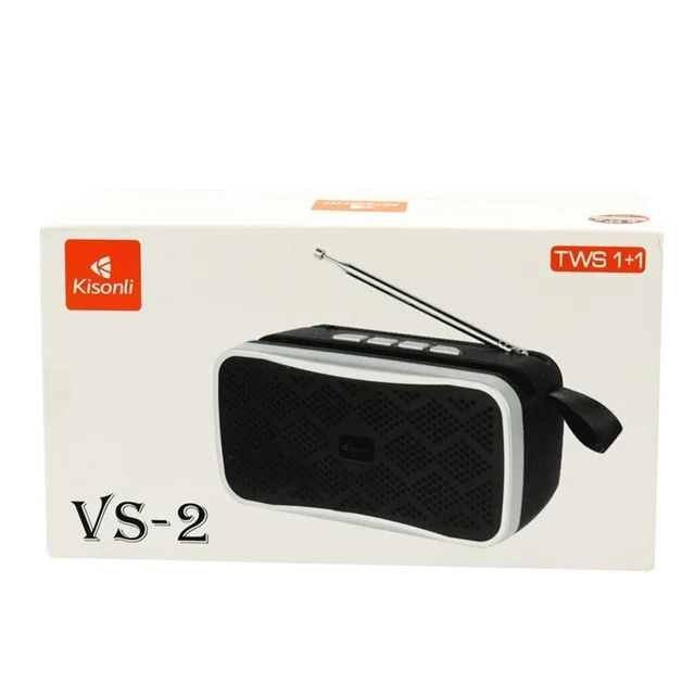 اسپیکر مدل VS2 برند کیسونلی از جنس پلاستیک مقاوم و به صورت مستطیل شکل طراحی شده و یک بند نیز به آن متصل می باشد که حمل و جابجایی این دستگاه را برای کاربر راحت تر کرده است. این اسپیکر پرتابل، توسط بلوتوث نسخه ۵٫۰ با پشتیبانی از شعاع ۱۰ متر، به گوشی های موبایل و دیگر گجت های سازگار جفت می شود و صدایی قدرتمند را به گوش می رساند. روش های دیگری برای اتصال، از طریق رابط جک صوتی ۳٫۵ میلی متری صدا (AUX)، شیار کارت حافظه رم میکرو و پورت فلش مموری USB نیز بر روی این پخش کننده فراهم شده تا دسترسی های راحت تری به فایل های صوتی و لیست آهنگ هایتان جهت پخش داشته باشید. VS-2 از پخش رادیو FM پشتیبانی می کند و با آنتن خارجی که بر روی آن قرار دارد، دریافت سیگنال موج های رادیویی بدون نویز امکانپذیر است تا برنامه های رادیویی را باکیفیت صدایی بالا و شفاف بشنوید. این اسپیکر با توان خروجی ۵ وات، درایو هایی به قطر ۵۲ میلی متر و امپدانس ۳ اهم، صدایی استریو و با وضوح فراگیر را پخش خواهد کرد. کیسونلی VS-2 پخش کننده صوتی خود را به یک باتری ۱۲۰۰ میلی آمپر ساعتی مجهز کرده که می تواند حدود ۳ تا ۵ ساعت ماندگاری شارژ برای پخش موسیقی و دیگر حالت ها داشته باشد. پس از تمام شدن شارژ، به وسیله یک کابل میکرو یو اس بی امکان شارژ مجدد باتری در مدت زمان بین ۲ تا ۴ ساعت برای کاربر وجود دارد. قسمت بالای بدنه اسپیکر یک سری کلید فیزیکی تعبیه شده تا تغییر میزان حجم صدا، آهنگ قبلی و بعدی، Mode و تنظیمات بخش موسیقی را راحت تر مدیریت کنید. یکی از ویژگی های Kisonli VS-2، قابلیت TWS است که امکان اتصال همزمان به دو اسپیکر را برای افزایش قدرت صدا و لذت بیشتر از گوش دادن به موسیقی موردعلاقه تان فراهم می کند.
